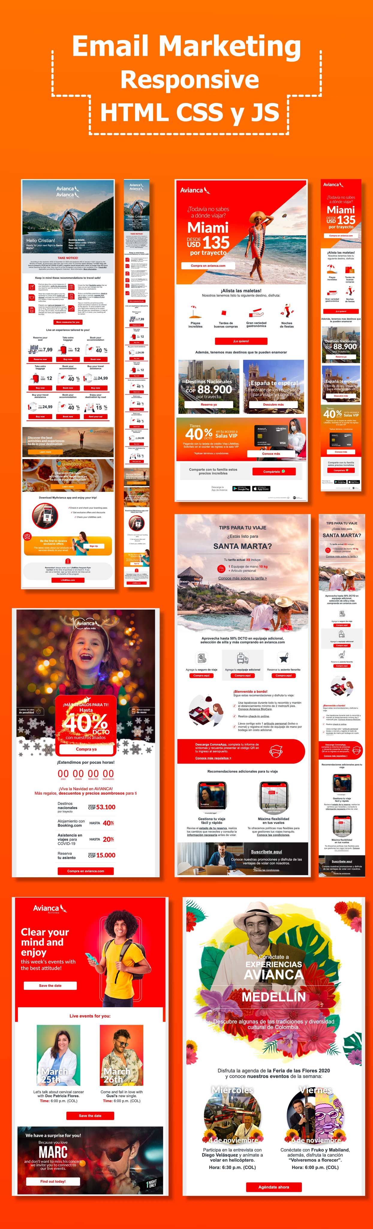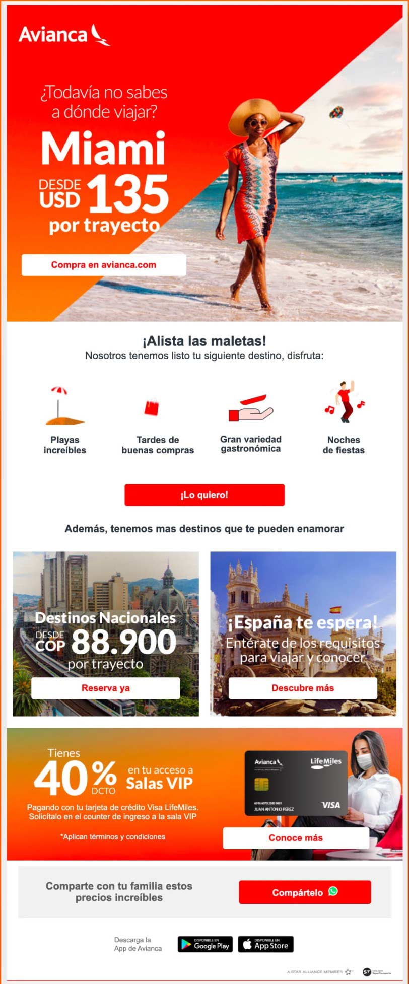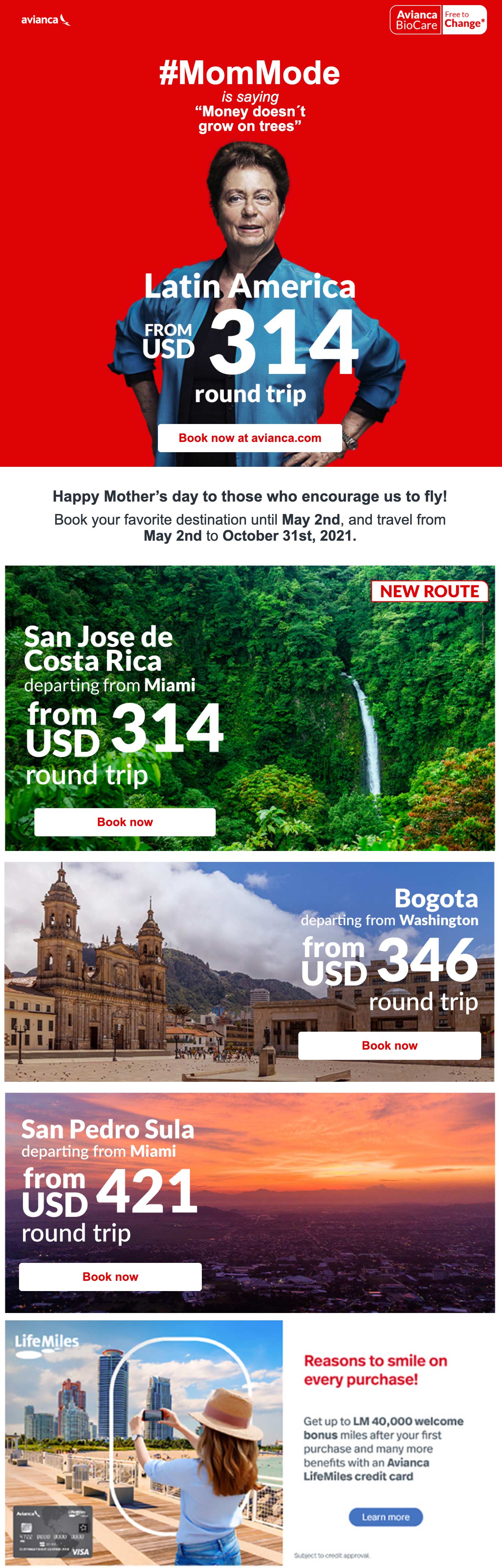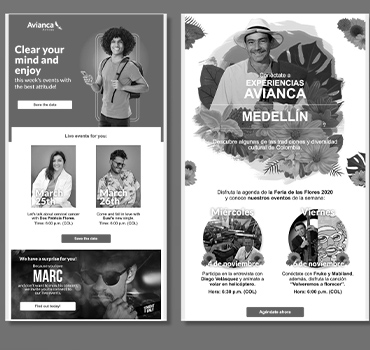 At Avianca, I designed high-impact email and eCard campaigns that supported multi-channel launches and consistently contributed to campaigns generating $4–5M in revenue. By applying personalization, modular email systems, mobile-first layouts, and dynamic content, aligned with industry trends at the time, these campaigns proved how strong email design directly influences revenue at scale.